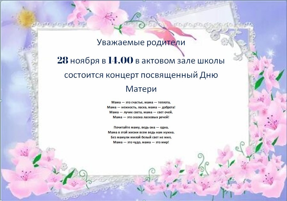 Уважаемые родители, приглашаем вас на концерт, который состоится 28 ноября в 14.00 в актовом зале школы.