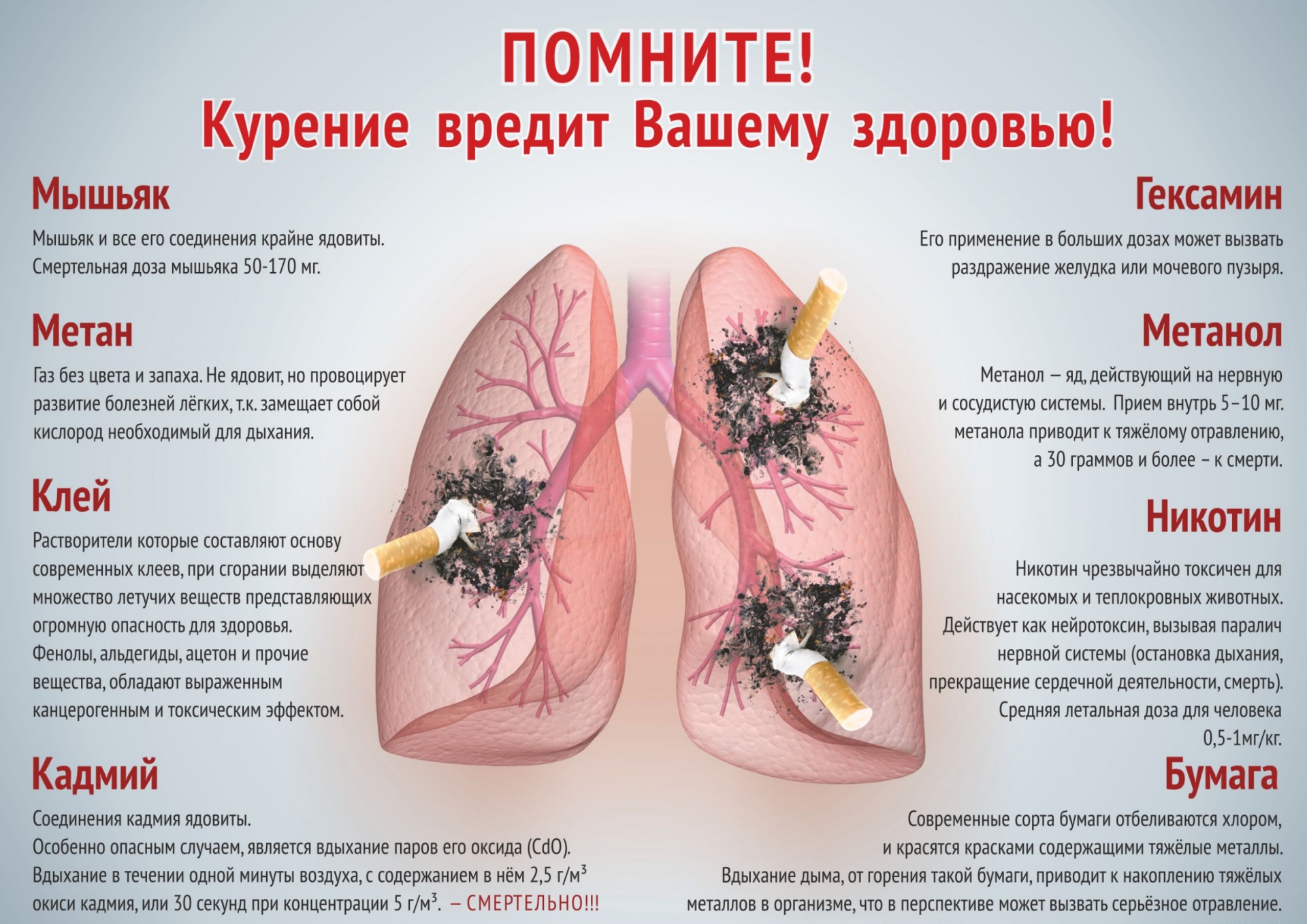 Курение признано одним из ключевых факторов риска онкологических, сердечно-сосудистых и респираторных заболеваний. Никотин и продукты горения оказывают комплексное негативное воздействие на организм: способствуют ухудшению памяти, ослаблению иммунитета, нарушению работы сердечно-сосудистой и репродуктивной систем, повышают риск сахарного диабета, множества онкологических заболеваний, вызывают хронические болезни органов дыхания и негативно влияют на зрение.