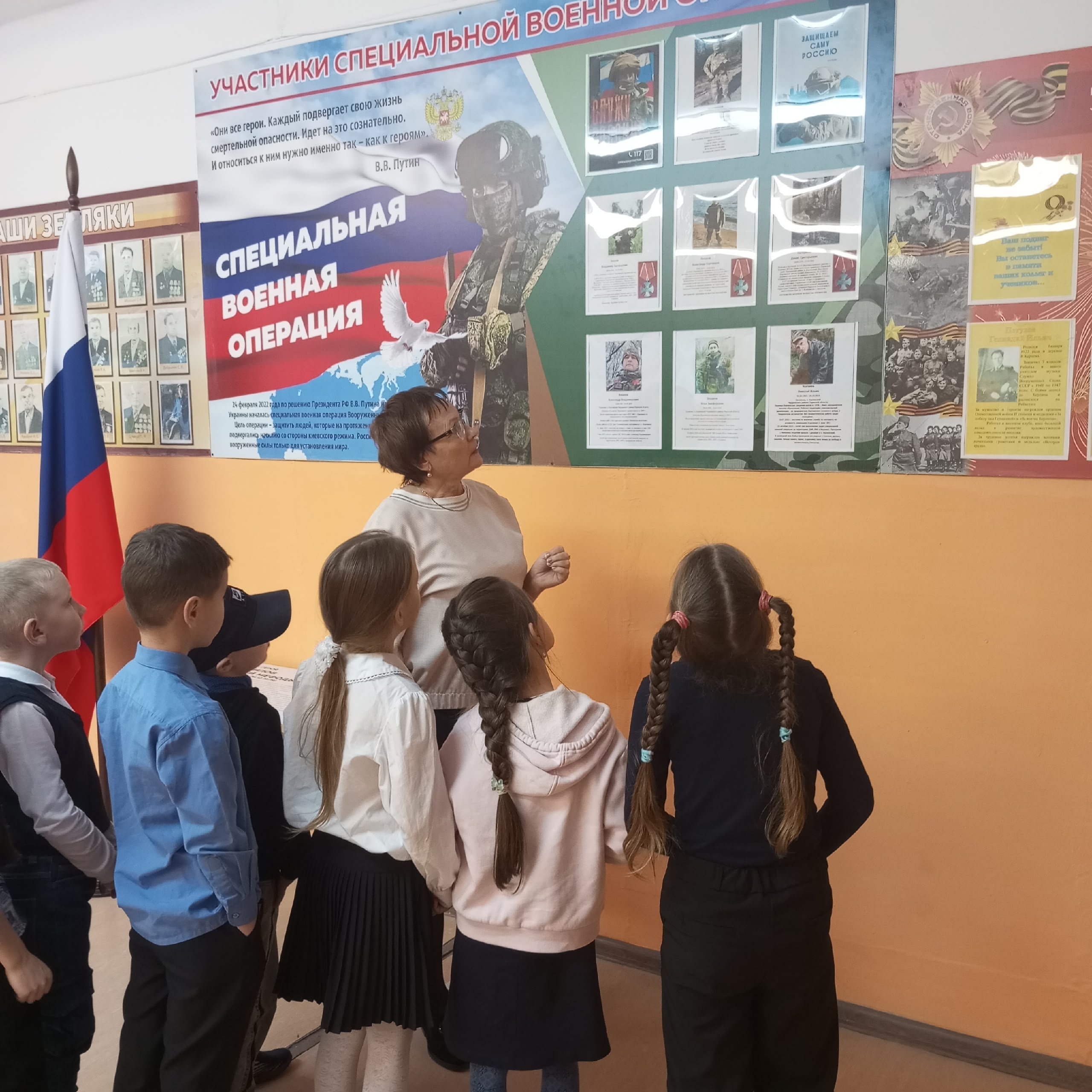📍Руководитель школьного музея Суханова О. В. провела с учащимися 2 - 7 классов несколько экскурсий у Стены Памяти. Обучающиеся узнали о бессмертных подвигах наших земляков, ветеранов ВОВ. В ходе встречи также шел разговор и о Героях современной России, тех, кто порой ценой собственной жизни сражался и сражается за наше счастливое будущее и мирное небо над головой. С учащимися 8 класса прошла встреча с выпускником нашей школы, участником СВО. В 7-х классах прошла интерактивная игра "Путь героя".