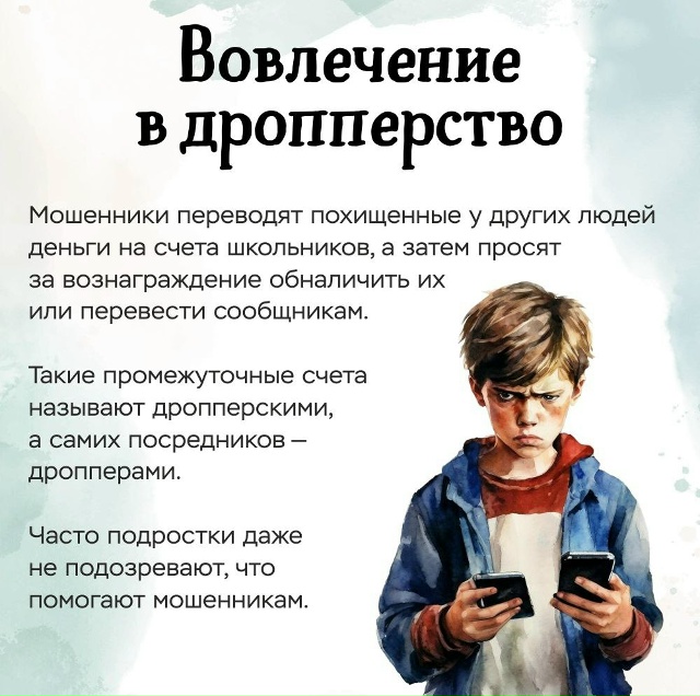 Дорогие родители и дети! В последнее время распространены случаи мошенничества, известного как «дропперство». Это явление представляет собой использование обманным путем ресурсов, данных или средств других людей для достижения личной выгоды. Важно быть бдительными и понимать, как избежать таких ситуаций.